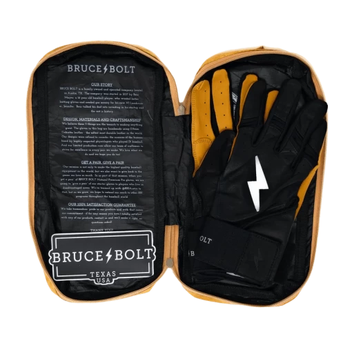 BRUCE BOLT is the newest name in baseball. Their batting gloves are some of the highest quality, best fitting, most durable gloves in the game. They’re made from the ultra premium 0.9mm Cabretta leather and feature a proprietary Double Inverse Cuff System which creates a more powerful swing and unmatched wrist support at the point of contact. Each pair of BRUCE+BOLT gloves are handmade by highly skilled craftsmen. It’s unlike any other glove out there.