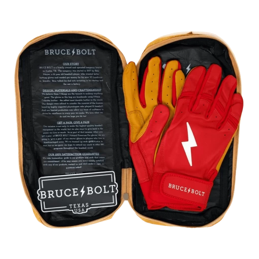 Each pair of BRUCE BOLT Red batting gloves are handmade by skilled craftsmen using only the highest quality 0.9mm Cabretta leather and stitching techniques which makes Bruce Bolt gloves buttery soft but more durable than any other glove on the market.