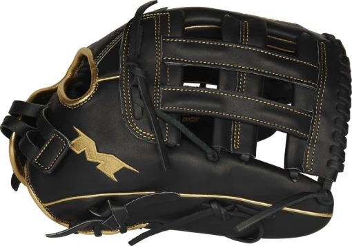 The Limited Edition GOLD Series 14″ Slowpitch Fielding Glove from Miken offers an amazing new amazing colorway. This Miken Pro Series glove offers a black quality soft full-grain leather for amazing shape retention and limited player break in with Gold Accents all over the glove. The Poron XRD palm and index finger pads are designed specifically to reduce ball impact. Each glove comes with a quick pull strap on the back for perfect fit for every player.