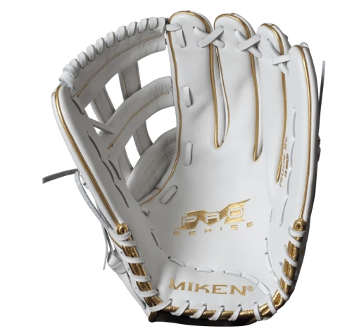 The Limited Edition GOLD Series 14″ Slowpitch Fielding Glove from Miken offers an amazing new amazing colorway. This Miken Pro Series glove offers a white quality soft full-grain leather for amazing shape retention and limited player break in with Gold Accents all over the glove. The Poron XRD palm and index finger pads are designed specifically to reduce ball impact. Each glove comes with a quick pull strap on the back for perfect fit for every player.